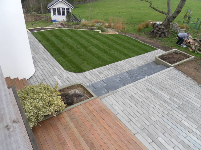 Built in layers with with slim porcelain tile slabs and hardwood decking on the top laying, stepping down with rendered concrete arched flower beds either side, down the the lawn areas.
